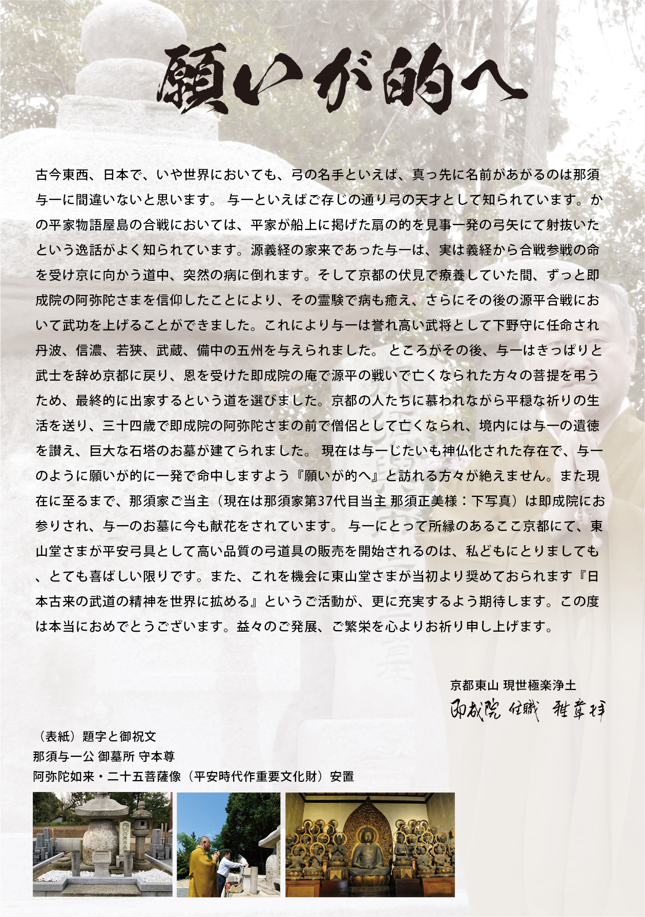 古今東西、日本で、いや世界においても、弓の名手といえば、真っ先に名前があがるのは那須与一に間違いないと思います。 与一といえばご存じの通り弓の天才として知られています。かの平家物語屋島の合戦においては、平家が船上に掲げた扇の的を見事一発の弓矢にて射抜いたという逸話がよく知られています。源義経の家来であった与一は、実は義経から合戦参戦の命を受け京に向かう道中、突然の病に倒れます。そして京都の伏見で療養していた間、ずっと即成院の阿弥陀さまを信仰したことにより、その霊験で病も癒え、さらにその後の源平合戦において武功を上げることができました。これにより与一は誉れ高い武将として下野守に任命され丹波、信濃、若狭、武蔵、備中の五州を与えられました。 ところがその後、与一はきっぱりと武士を辞め京都に戻り、恩を受けた即成院の庵で源平の戦いで亡くなられた方々の菩提を弔うため、最終的に出家するという道を選びました。京都の人たちに慕われながら平穏な祈りの生活を送り、三十四歳で即成院の阿弥陀さまの前で僧侶として亡くなられ、境内には与一の遺徳を讃え、巨大な石塔のお墓が建てられました。 現在は与一じたいも神仏化された存在で、与一のように願いが的に一発で命中しますよう『願いが的へ』と訪れる方々が絶えません。また現在に至るまで、那須家ご当主(現在は那須家第37代目当主 那須正美様:下写真)は即成院にお参りされ、与一のお墓に今も献花をされています。 与一にとって所縁のあるここ京都にて、東山堂さまが平安弓具として高い品質の弓道具の販売を開始されるのは、私どもにとりましても、とても喜ばしい限りです。また、これを機会に東山堂さまが当初より奨めておられます『日本古来の武道の精神を世界に拡める』というご活動が、更に充実するよう期待します。この度は本当におめでとうございます。益々のご発展、ご繁栄を心よりお祈り申し上げます。